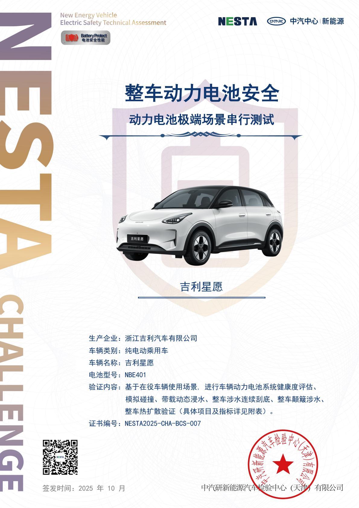 吉利星愿搭载行业首款11合1智能电驱,在功能高度集成的同时,还拥有同级领先的89.2%电驱效率,实现了同级最小的66L体积,将节省的空间以超大后备箱的形式还给了用户。通过了3000小时的台架耐久和200万公里的真实路试,星愿电驱完成了浸水工作、高温耐久、电磁抗扰、扭矩冲击、机械冲击等7大高难度挑战,获得了中汽研《高可靠电驱》的认证。