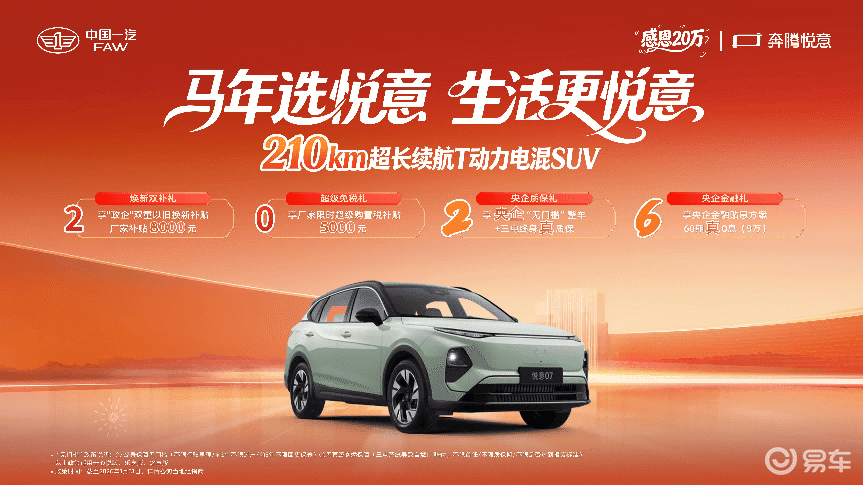 强大的福利保障背后,是一汽奔腾悦意系列对产品实力的绝对自信。马年选悦意,纯电选悦意03,电混选悦意07,两款车型精准覆盖不同出行需求,尽显大厂技术底蕴。