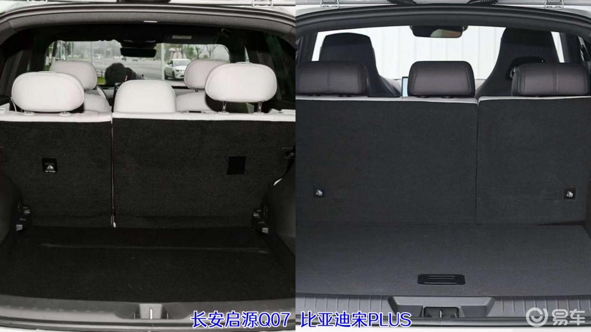 后备箱部分,长安启源Q07因为有着双层后备箱设计,所以常规容积就达到了763L。至于宋PLUS DM-i,574L的常规容积,虽然满足家用绰绰有余,但如果坐满人又有行李要放的情况下,长安启源Q07的表现显然要从容一些,再加上长安启源Q07还支持后排纯平放倒,除了进一步拓展了载物空间以外,还可以当做大床房来休息使用。放倒后排之后它的后备箱容积达到1759L,优于宋PLUS DM-i的1440L。