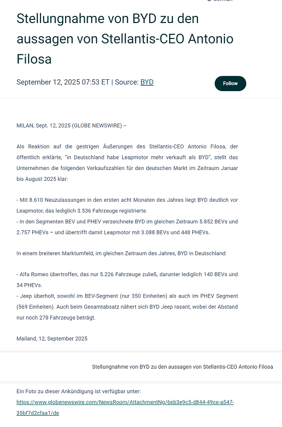 近日,斯特兰蒂斯(Stellantis)集团CEO在一次采访中盛赞了中国合作伙伴零跑汽车,并称其在德销量超过比亚迪,比亚迪随后也对此作出回应。