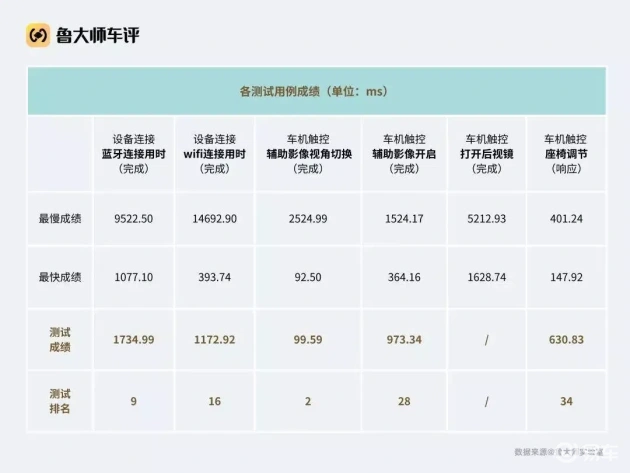 特别是在应用菜单和车机设置项内容滑动测试中,成绩分别为101.25毫秒和97.48毫秒,表现非常出色,分别位列榜单第3和第6。多指滑动响应时间为167.92毫秒,也依然处于榜单前列。