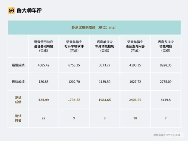 语音系统依然是理想的强项之一。基础唤醒的平均响应时间为425毫秒,能够做到快速反馈,处于行业上游。打开车机软件和控制车身功能的响应时间分别为1.8秒和2.0秒,表现稳定,且均进入榜单前十。
