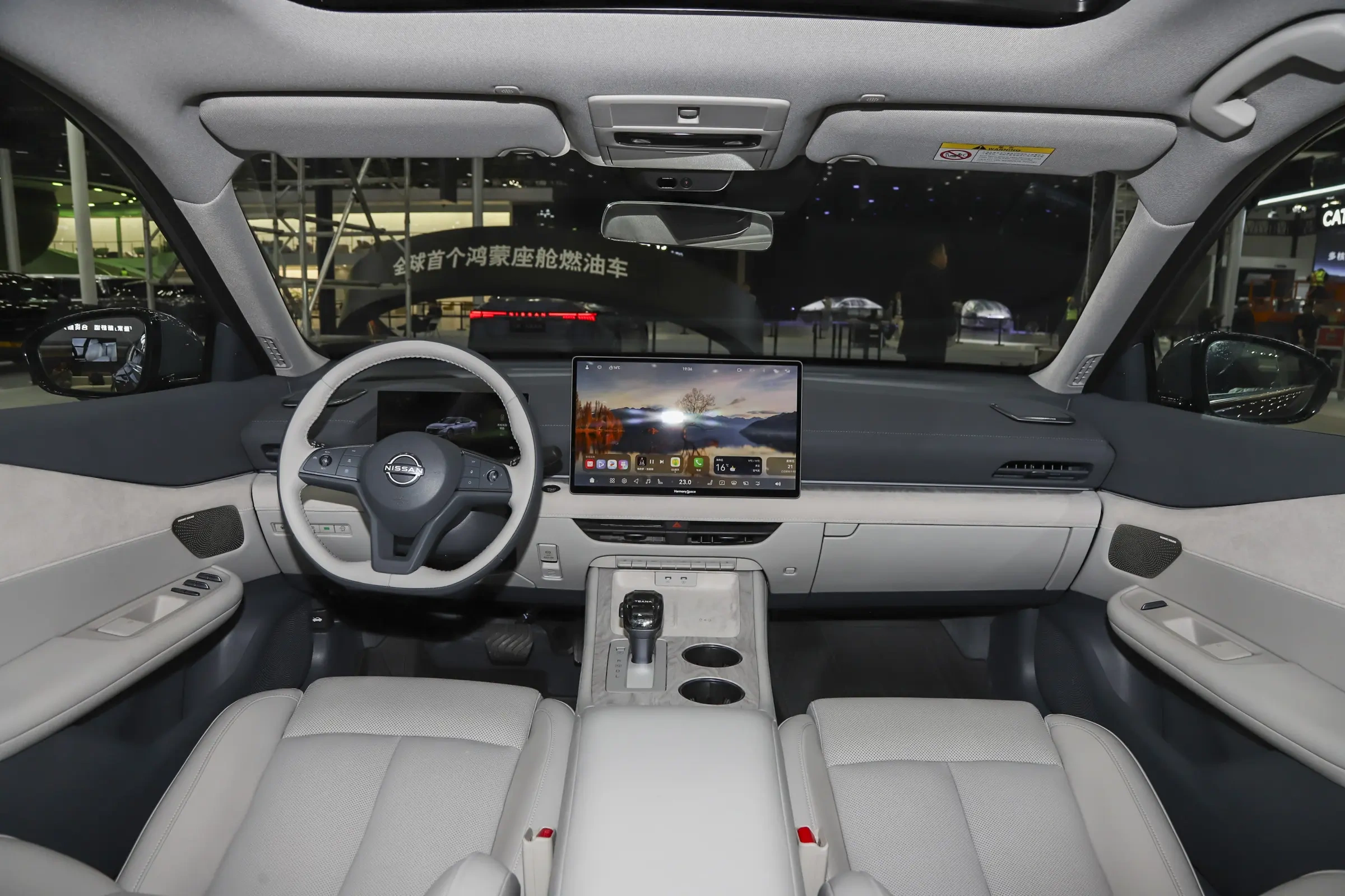 进入到内饰,天籁的座舱与旧款已经没有了什么关联。三辐式方向盘样式上与旧款相同,但它不仅有内外撞色,更重新设计了控制面板。而车辆门板变为了平直扶手,10.25+15.6英寸双液晶屏也配上了更简练的出风口与贯穿装饰带,这些都在让座舱看上去更现代化。如果不是车辆保留了大挡把造型,相信很多人应该会误以为这是一台电车。