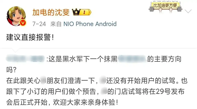 例如,在重磅新车乐道L90上市的关键节点前后,面对友商高管质疑乐道在新车宣传方面有雇佣网络水军的操作,沈斐在其个人微博直接跟帖回怼:“建议直接报警。”
